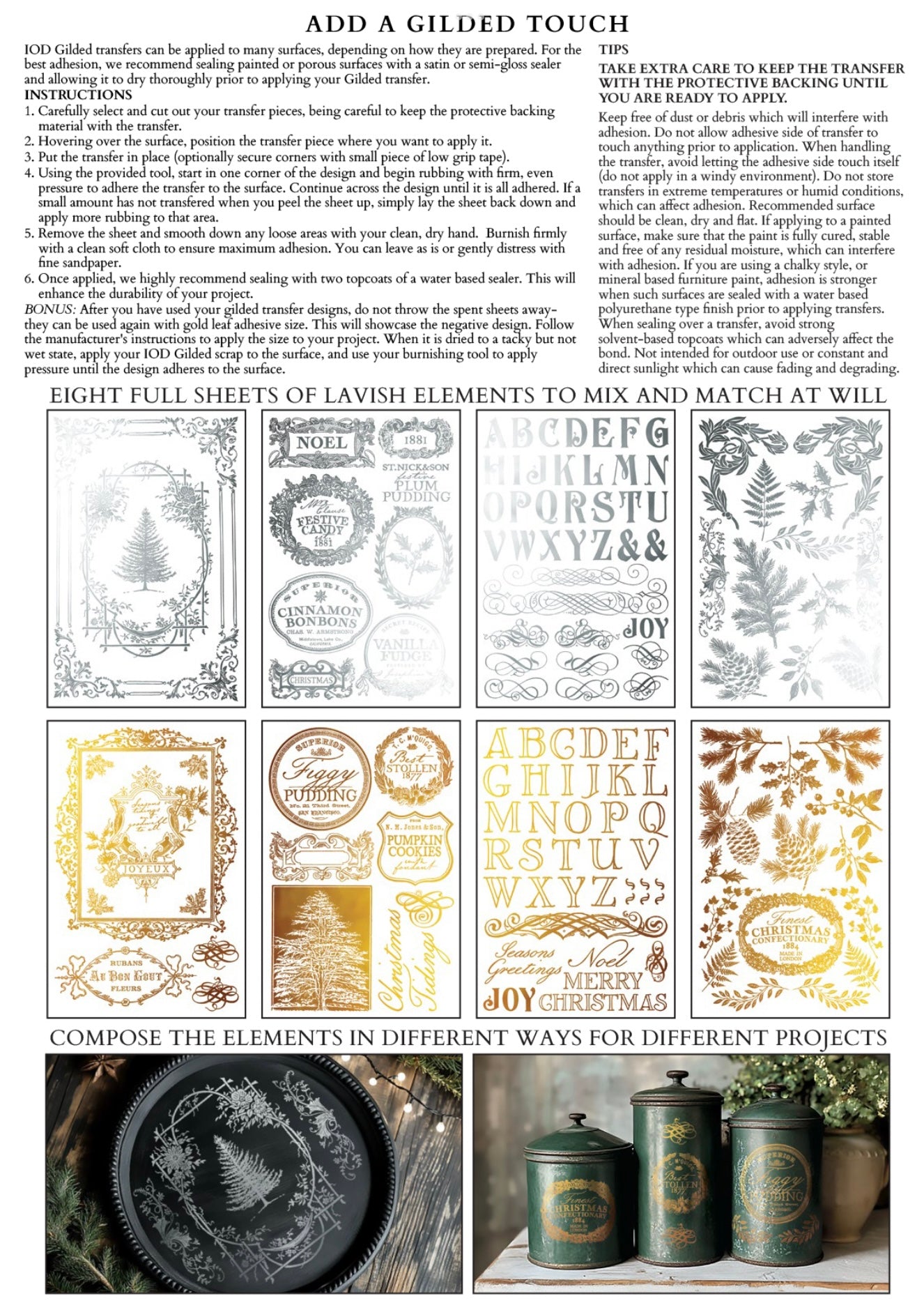 Eight 8x12 sheets Meet Figgy & Flourish, our most luxe holiday gilded transfer yet, and yes, it’s gleaming with both gold and silver details! Inspired by old book cover foiling, printer’s ornamentation, and vintage labels, this festive beauty is glistening. The intricate flourishes, detailed borders, and elegant edges are refined but not fussy. Think of all the beautiful adornments on personalized ornaments, handmade gifts, or shimmery accents on tags and cards, oh my! Personalize clear glass Christmas ornaments with gilded letters, label cookie jars and candy vases for sweet handmade gifts. Use with holiday cards and tags, layered with foliage from Winter Botanist, Santa’s Hollow, or Christmas Joy. It’s like a dazzling collection of treasures ready to adorn your projects with extra sparkle and charm.