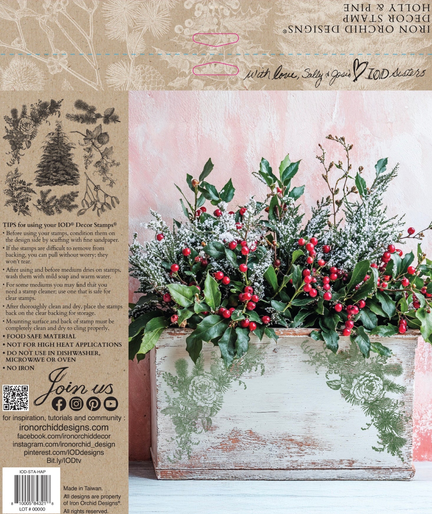 IOD 12x12 stamp Like a peaceful winter walk through snowy pine trees, Holly & Pine wraps the beauty of the season into a single stamp. We love Holly & Pine for stamping on kraft paper gift wrap, a festive border on gift bags, or making the most charming handmade tags with letters from Apothecary Labels or Insignia for names and monograms. We can’t wait to try stamping these delicate woodsy designs into air dry clay for a textural ornament! You can also nestle a few of the foliage clusters into the corners of a wooden tray or thrifted box to hold holiday treats or faux florals. Those pine sprigs and holly leaves feel so festive and refined. We just love them!