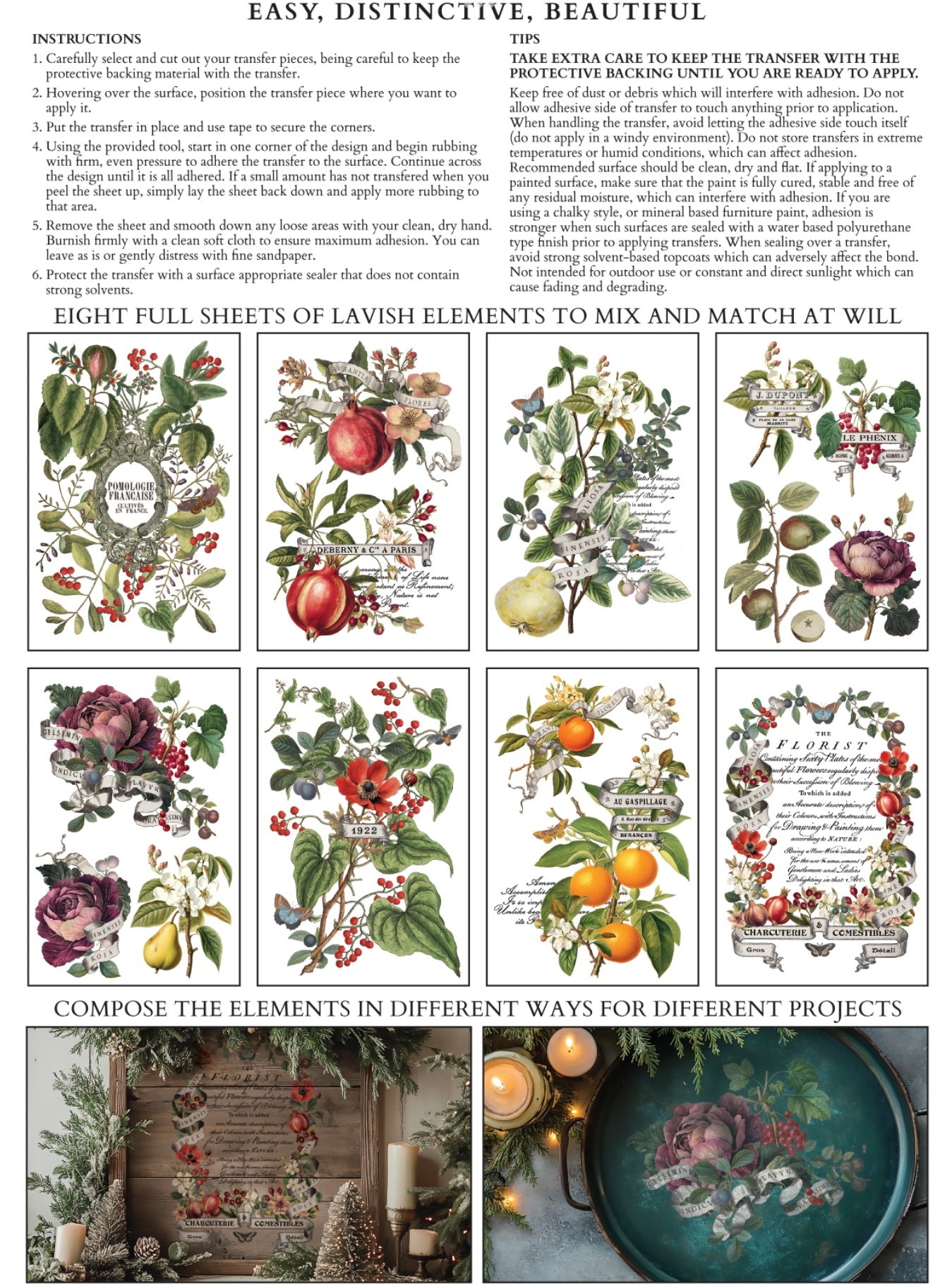 IOD Transfer eight 8x12 sheets. Meet Clementine, her rich, deep tones and scrumptious layers of elegant imagery add instant still life drama to your projects. Juicy clementines and moody rose inspired cabbages? Yes please! The intricate details are dripping with elegance and sophistication. And don’t get us started on those vintage curled ribbons that bring it all together. Dress up a thrifted tray for the kitchen or dining room with The Florist transfer sheet, use the entire set to create a gallery wall from thrifted frames, or add smaller elements to cookie boxes or candles for the dreamiest hostess gift. Layer in luminous foliage from Figgy & Flourish or tuck in whimsical insects from Wilde Bloemen. We can’t wait to see the scrumptious creations you dream up with Clementine!